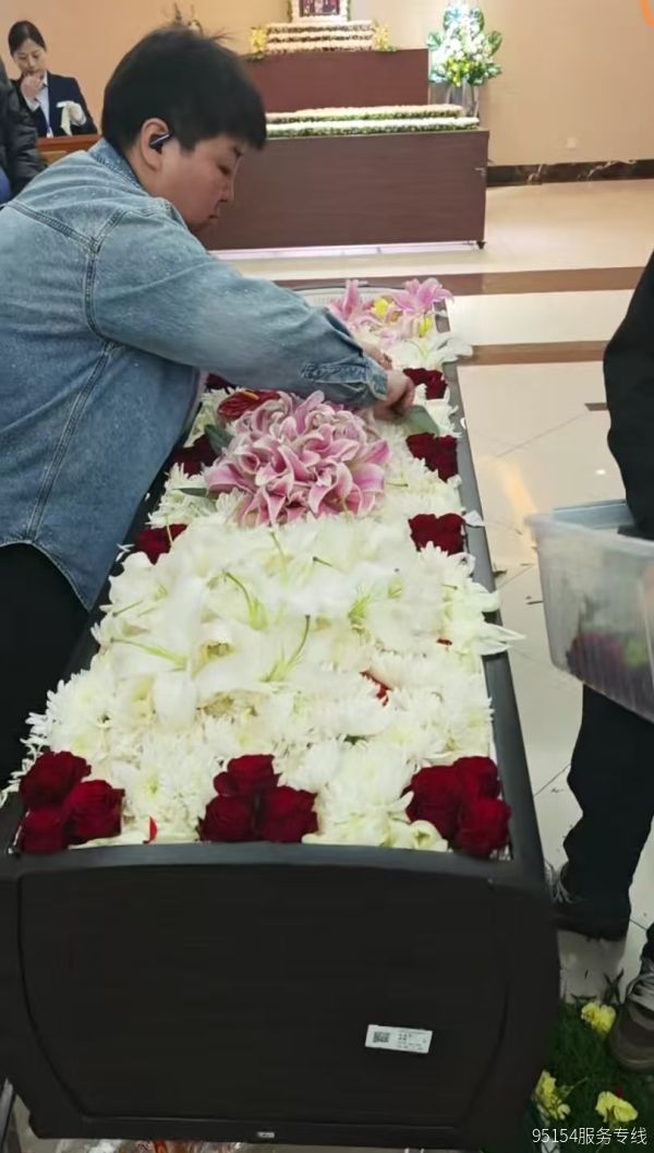 工作人员细心修剪着每一朵鲜花,将它们错落有致地铺陈在棺椁之上,层层叠叠的花束将棺木装点得庄重而温柔,指尖的动作里没有丝毫敷衍,只有对逝者的尊重与对家属的共情。